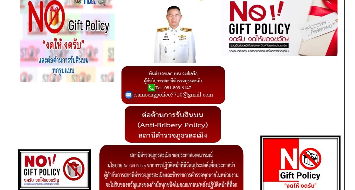 ดูประกาศได้ที่O18 > ประกาศนโยบายต่อต้านการรับสินบน (Anti-Bribery Policy) – สถานีตำรวจภูธรสะเมิง