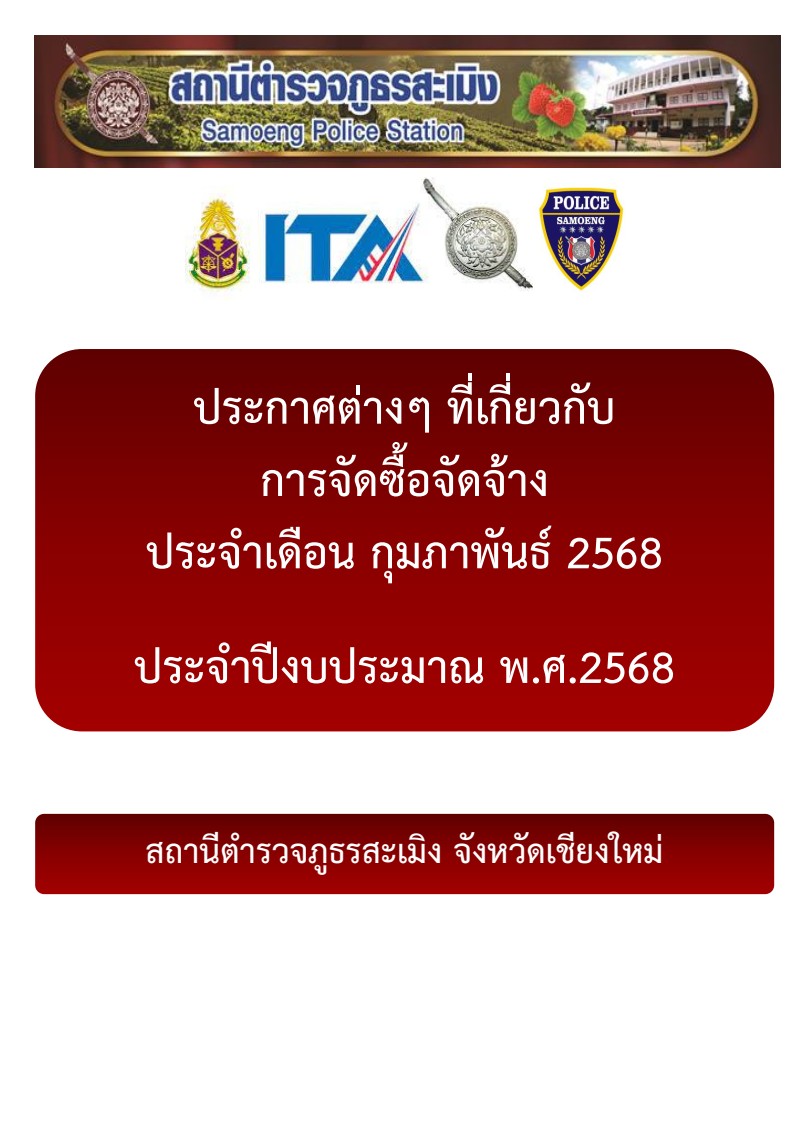 ประกาศการจัดซื้อจัดจ้าง ประจำปีงบประมาณ พ.ศ. 2568 (ตุลาคม 2567 - มีนาคม 2568) ของสถานีตำรวจภูธรสะเมิง